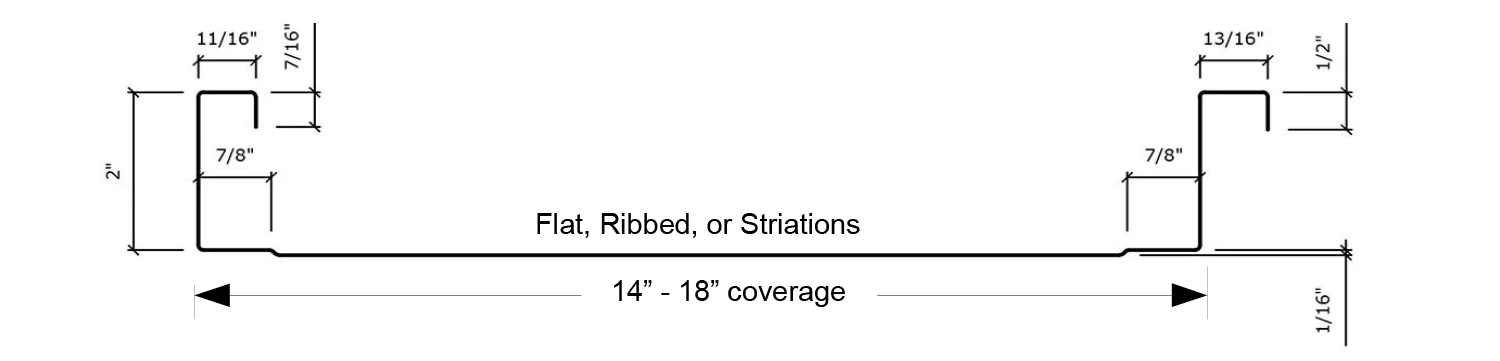 This panel is attached using concealed clips and is then mechanically seamed. This panel system can be installed on low or steep slope roofs and over open framing or solid wood and metal decks. This panel has a 2″ tall vertical seam.